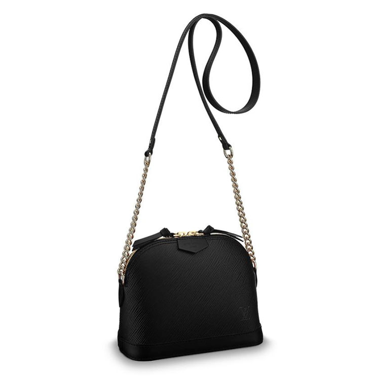 This adorable version of the ladylike Alma in grained Epi leather is a versatile day-to-evening piece. Trendy yet timeless, it features a long strap – perfect for cross-body wear – adorned with a golden-chain detail. Signatures include an embossed LV logo and a “Louis Vuitton Paris” patch.