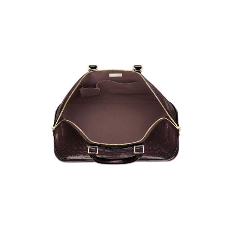Crafted in Monogram Vernis leather, Alma MM, a reinterpretation of an icon, is revisited for a glamorous look. This bag has a double zipper for easy opening and closure, and a padlock for added security.