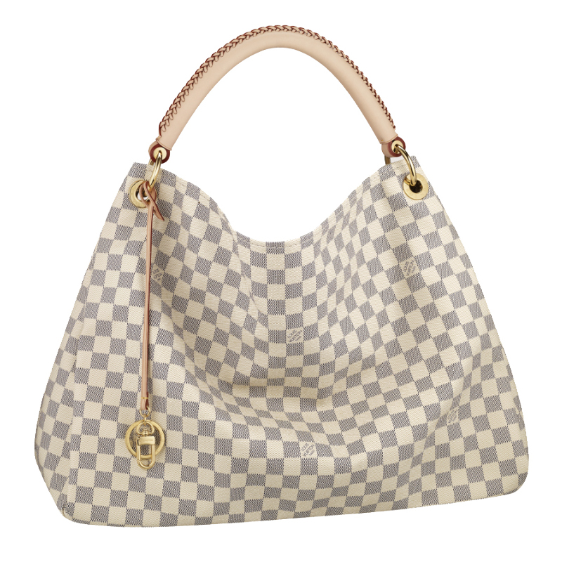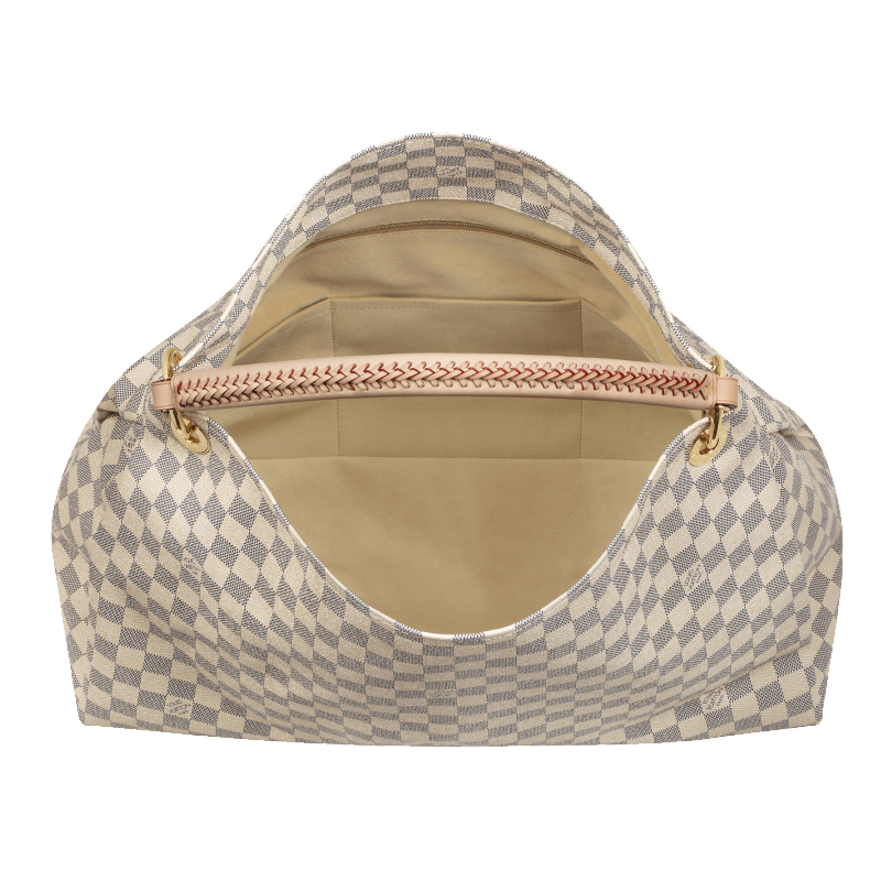 Capture the spirit of Bohemian chic with the generous Artsy GM. In supple and refreshing Damier Azur canvas, the exquisite detailing of its ornate handcrafted leather handle adds delightful touch.