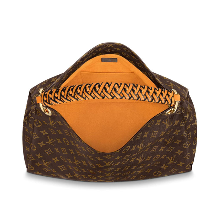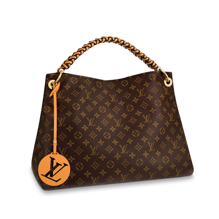 For Winter 2018 the Artsy shoulder bag in supple Monogram canvas is updated with crafted details that showcase House savoir-faire. The braided top handle is woven of colored leather strips, each one individually edge-dyed for a refined, dimensional effect. An oversized LV leather charm adds a playful signature to this classic boho-chic piece.