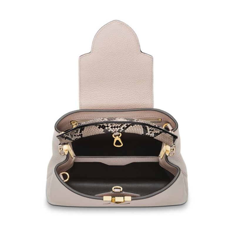 The fashionable mini size of Capucines BB lends an intense pop of contrasting colors to wardrobe styles from classic to daring. The Capucines BB comes with a removable long shoulder strap for casual shoulder or cross-body wear.