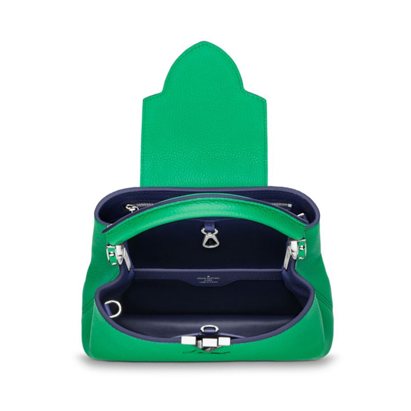 The fashionable mini size of Capucines BB lends an intense pop of contrasting colors to wardrobe styles from classic to daring. Finished with shiny silver color accents, the Capucines BB comes with a removable long shoulder strap for casual shoulder or cross-body wear.