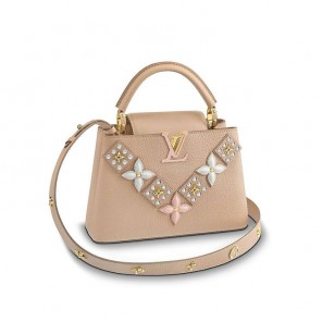 Made of colorful Taurillon skin in a charming BB size, the Capucines Flower Smile for Summer ’18 is embellished with leather Monogram Flowers and metal-studded Ta?ga leather patches. The motifs form a “V” for Vuitton along the top of the bag. The long strap, for shoulder or cross-body carry, is also accented with shiny golden Monogram blossoms.