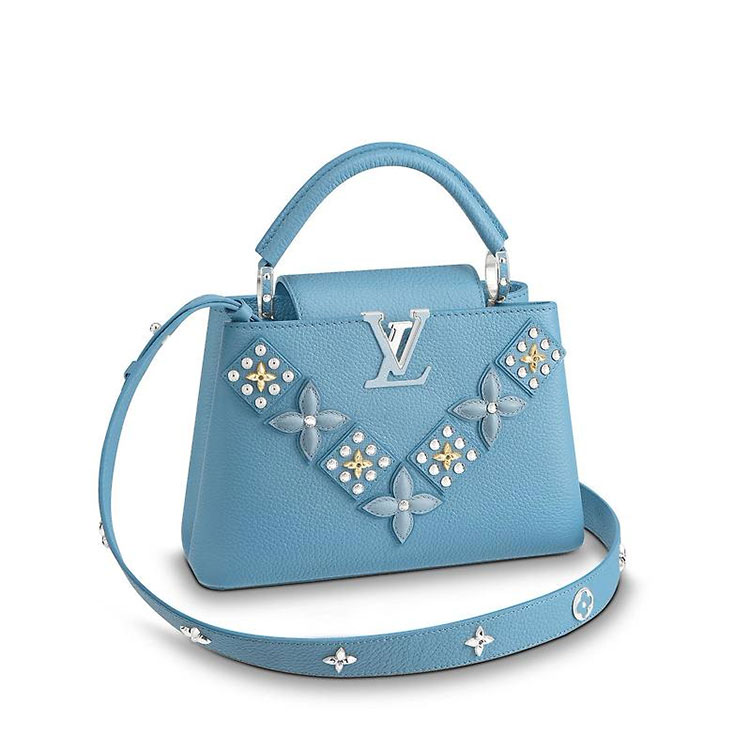Made of colorful Taurillon skin in a charming BB size, the Capucines Flower Smile for Summer ’18 is embellished with leather Monogram Flowers and metal-studded Ta?ga leather patches. The motifs form a “V” for Vuitton along the top of the bag. The long strap, for shoulder or cross-body carry, is also accented with shiny golden Monogram blossoms.