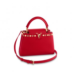 Here’s a new twist for the elegant Capucines: a gleaming “necklace” of golden studs and eyelets, inspired by the fittings on classic Louis Vuitton trunks. Edgy and sophisticated, this BB model is crafted of full-grain Taurillon skin in glamorous red Rubis.