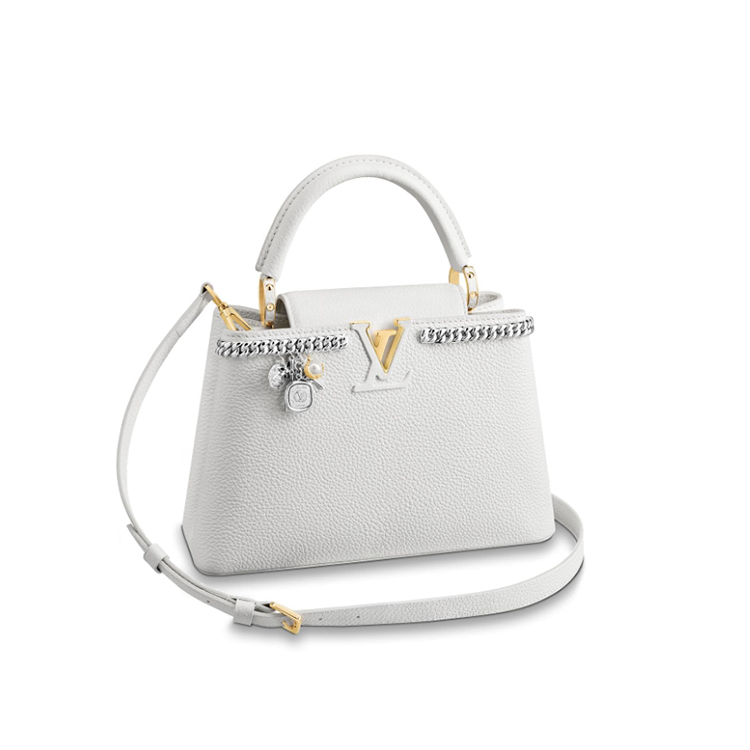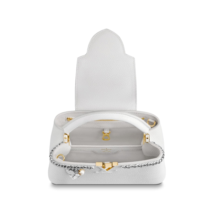 For Spring 2019,the Capucines BB handbag in white Taurillon leather is embellished with a silver-color chain bracelet inspired by the House’s fashion accessories. On the right-hand side, the chain is decorated the Louis Vuitton lock and key as well as a crystal Monogram Flower, making this a very feminine and elegant bag.