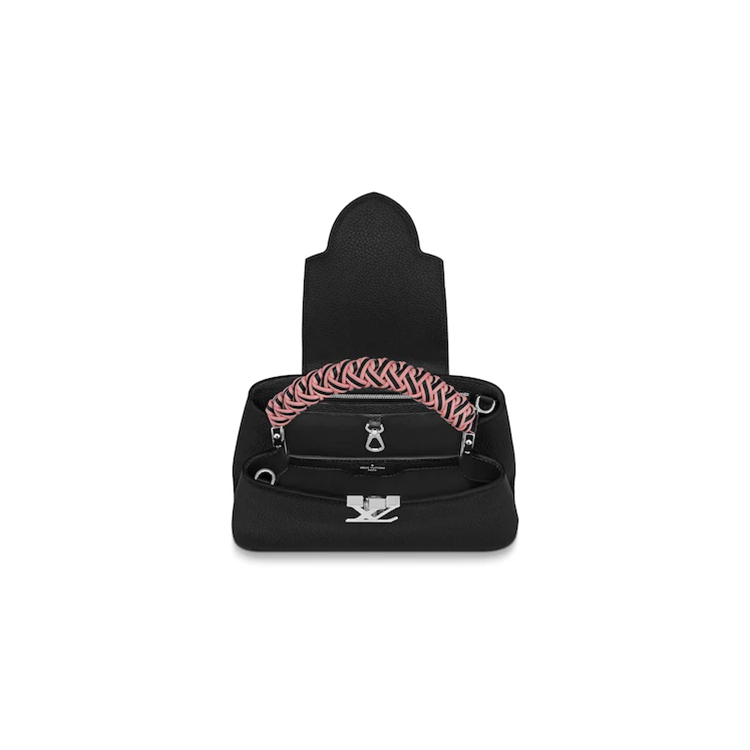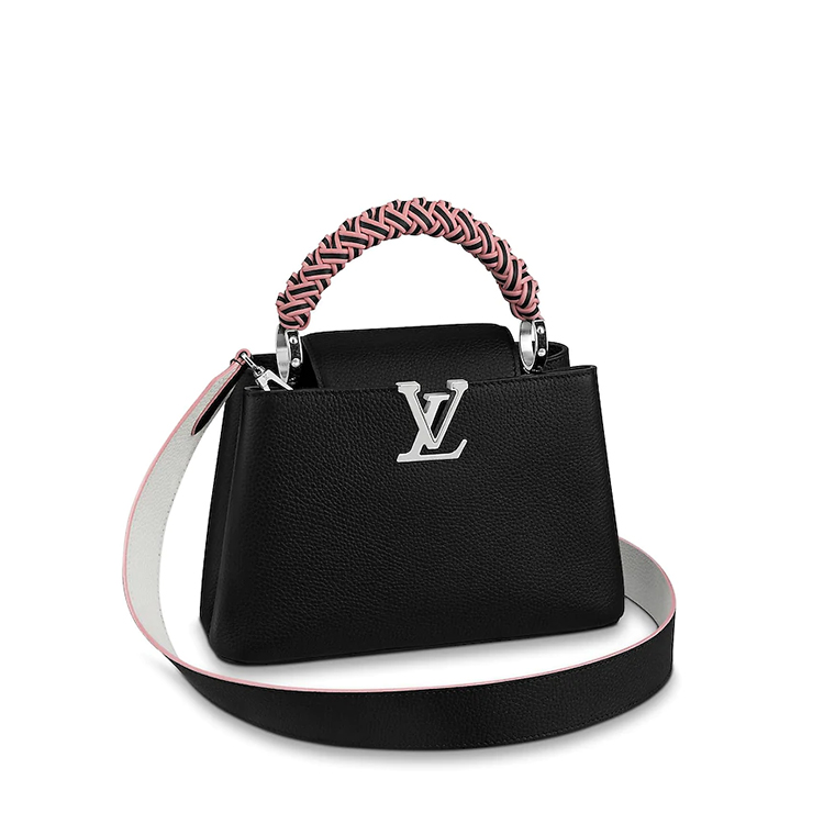 For Summer 2020, the Capucines BB is made from black Taurillon leather and finished with a braided-leather top handle in pink and black. This colorful alternative to pure glamourous black is completed with a two-tone detachable leather strap, black on one side and pink on the other.
