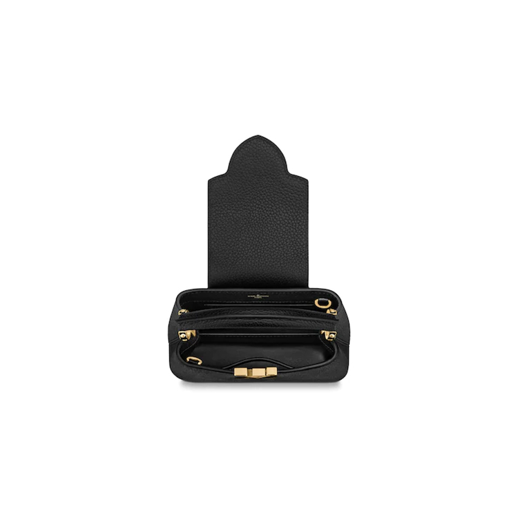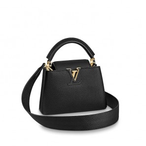 The refined Capucines Mini handbag looks stunningly chic in rich black Taurillon leather finished with golden handle rings and the emblematic LV Initials. This smaller version of the classic Capucines is a pleasure to carry over the shoulder or cross-body thanks to its wide removable strap.