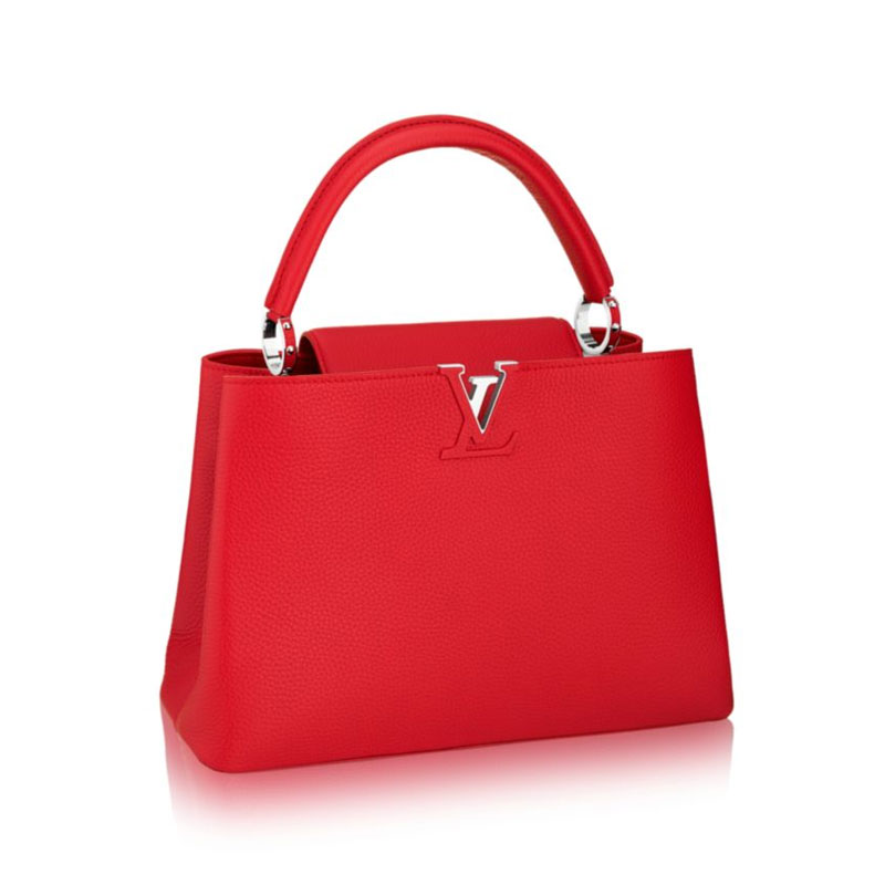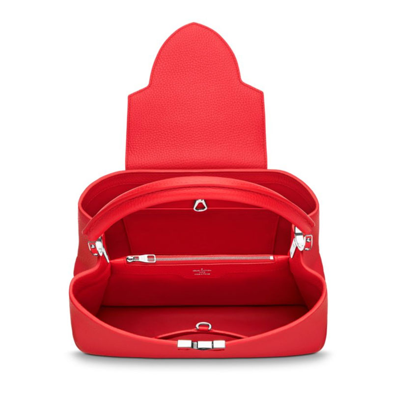Taking its name from the Rue des Capucines in Paris, where Louis Vuitton opened his first store in 1854, the timelessly elegant Capucines bag is a testament to fine leather craftsmanship. In full-grain Taurillon leather, it combines refined details, including a semi-rigid handle secured by jewel-like rings, with a spacious and functional shape offering two inside compartments. Its distinctive flap can be worn two ways: outside to reveal the outline of a Monogram flower, or inside to show the LV initials.