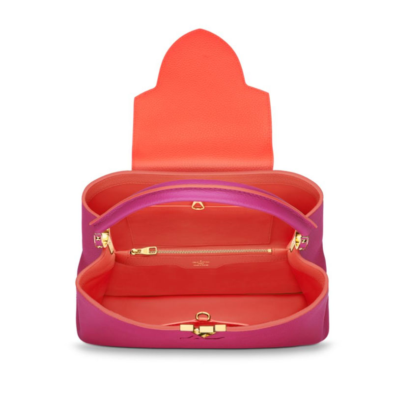 Taking its name from the Rue des Capucines in Paris, where Louis Vuitton opened his first store in 1854, the timelessly elegant Capucines bag is a testament to fine leather craftsmanship. In full-grain Taurillon leather, it combines refined details, including a semi-rigid handle secured by jewel-like rings, with a spacious and functional shape offering two inside compartments. Its distinctive flap can be worn two ways: outside to reveal the outline of a Monogram flower, or inside to show the LV initials.