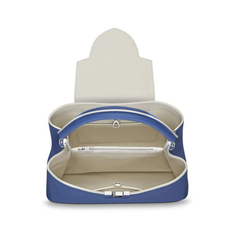 Taking its name from the Rue des Capucines in Paris, where Louis Vuitton opened his first store in 1854, the timelessly elegant Capucines bag is a testament to fine leather craftsmanship. In full-grain Taurillon leather, it combines refined details, including a semi-rigid handle secured by jewel-like rings, with a spacious and functional shape offering two inside compartments. Its distinctive flap can be worn two ways: outside to reveal the outline of a Monogram flower, or inside to show the LV initials.