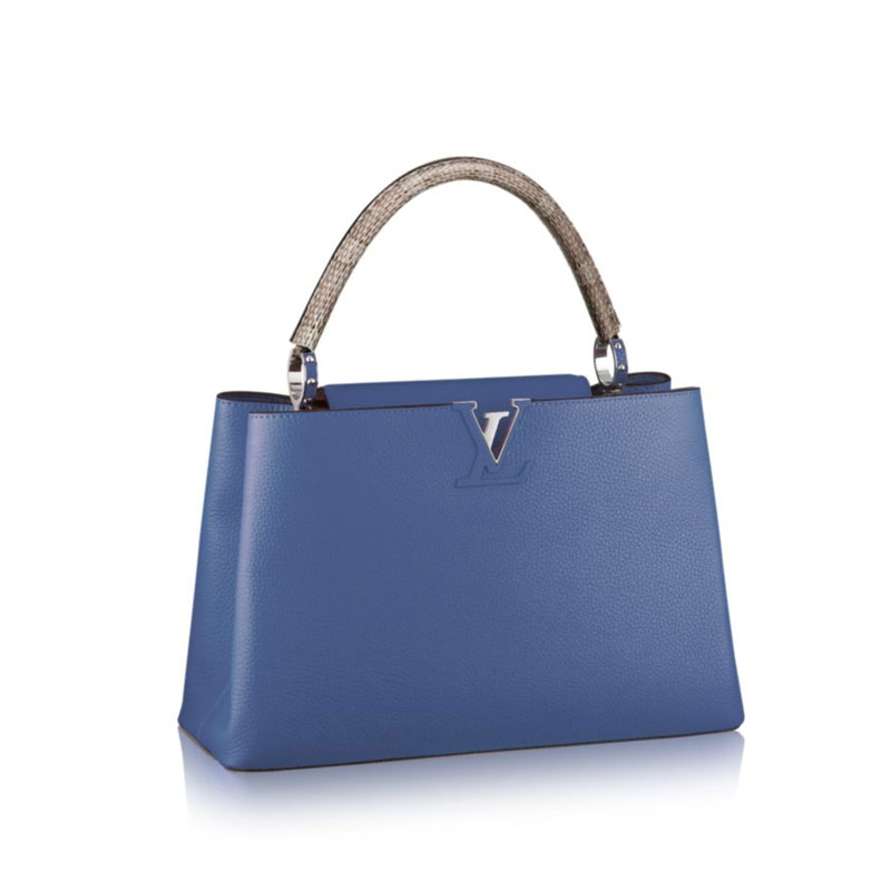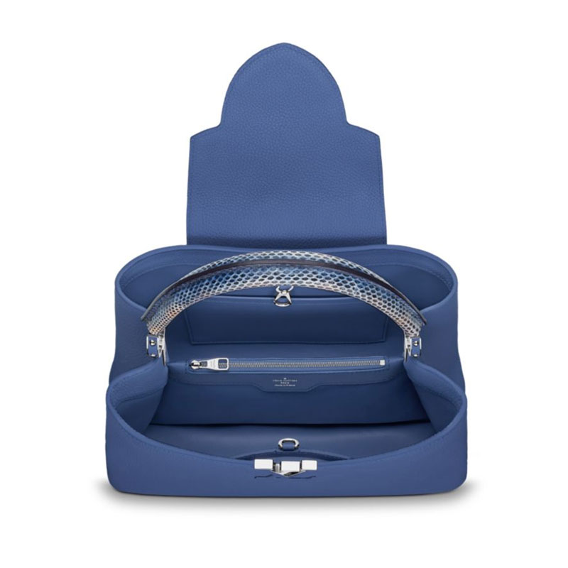 It was on the Rue des Capucines in Paris that the first Louis Vuitton store opened its doors. As timeless as the House itself, the Capucines bag brings chic sophistication to any look. Full-grain Taurillon leather combines with precious python ayers to create a luxurious handbag accented with heritage details: the LV initials, the distinctive side rings and the subtle Monogram flower on the closing flap. Its capacious interior makes the bag an ideal companion for a day of business or shopping.