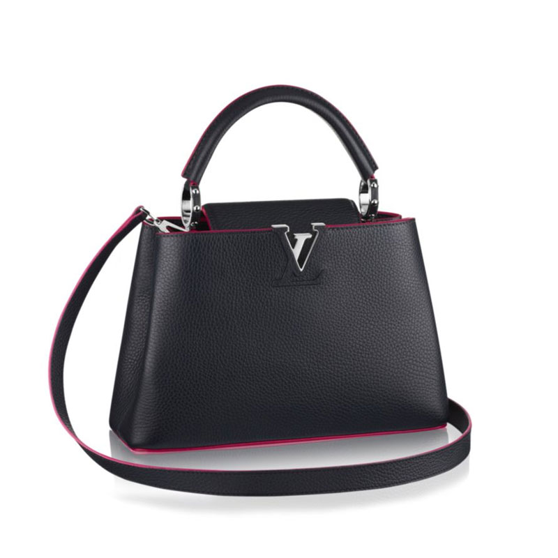 The fashionable mini size of Capucines PM lends an intense pop of contrasting colors to wardrobe styles from classic to daring. Finished with shiny color accents, the Capucines PM comes with a removable shoulder strap for casual shoulder or cross-body wear.