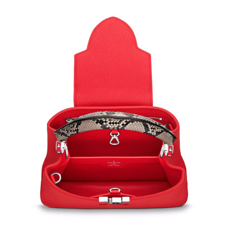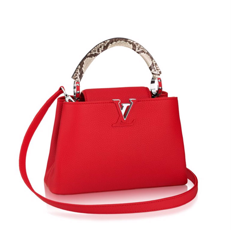 The fashionable mini size of Capucines PM lends an intense pop of contrasting colors to wardrobe styles from classic to daring. Finished with shiny color accents, the Capucines PM comes with a removable shoulder strap for casual shoulder or cross-body wear.