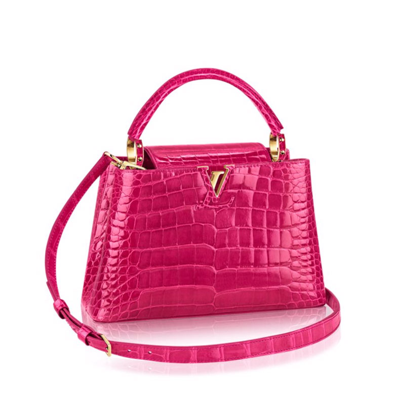 The fashionable size of Capucines PM lends an intense pop of contrasting colors to wardrobe styles from classic to daring. Finished with shiny color accents, the Capucines PM comes with a removable shoulder strap for casual shoulder or cross-body wear.
