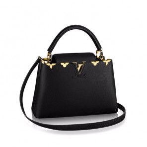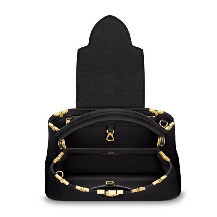 This season the House tells a new Capucines story. Embellished with a delicate frieze of metallic Monogram flowers, the emblematic bag is more feminine than ever. The PM model, in refined Noir with a crown of gold-toned blooms, is both elegant and practical.
