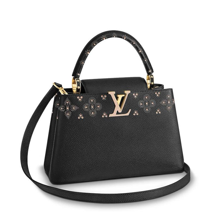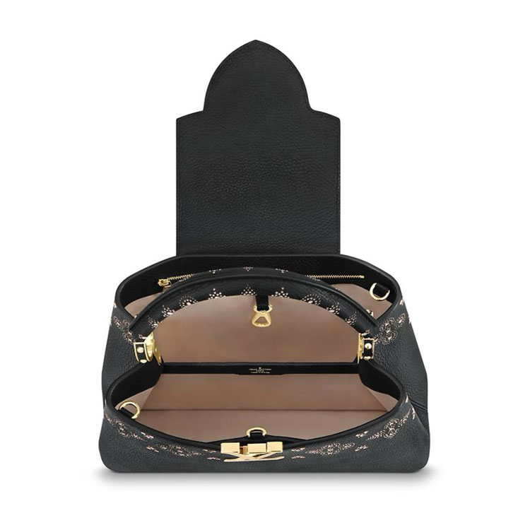 Delicate perforations on the top and handle of the Capucines Sweet Brogues bag, crafted of Taurillon leather, create a Monogram Flower pattern that is enhanced by a contrast backing of light-colored lambskin. This feminine PM model is ideal for daily wear, either carried by hand or worn over the shoulder on its detachable strap.