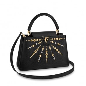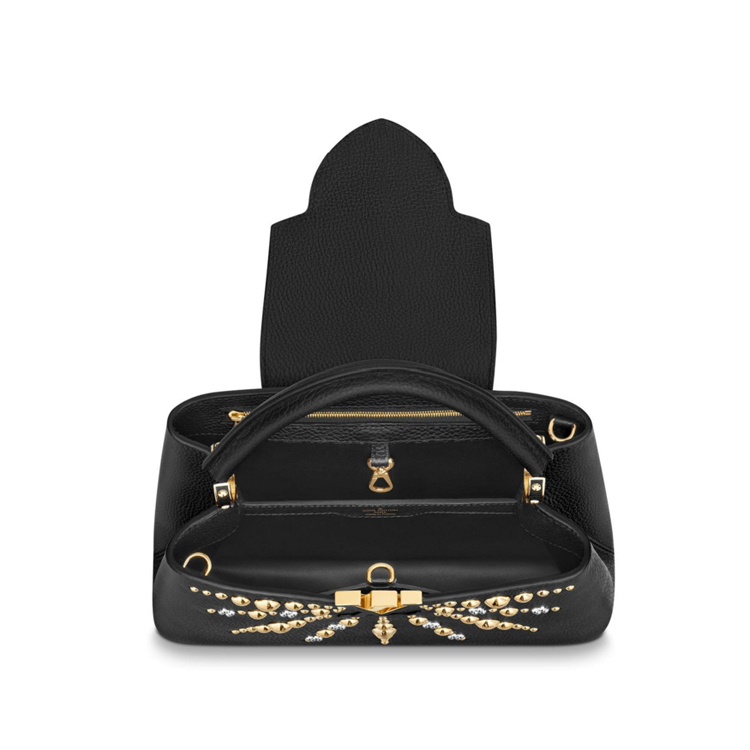 The sunburst motif on this Capucines PM handbag is a nod to the monumental Sun sculpture that reigns over the Louis Vuitton store on Place Vend?me in Paris. Composed of silver- and golden-finish studs, the shining rays give a modern, metallic allure to the ever-chic Capucines, crafted from full-grain Taurillon leather and lined in calfskin.