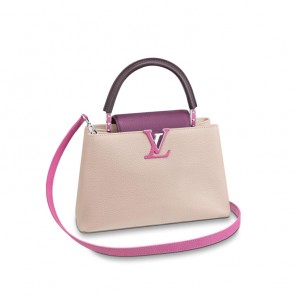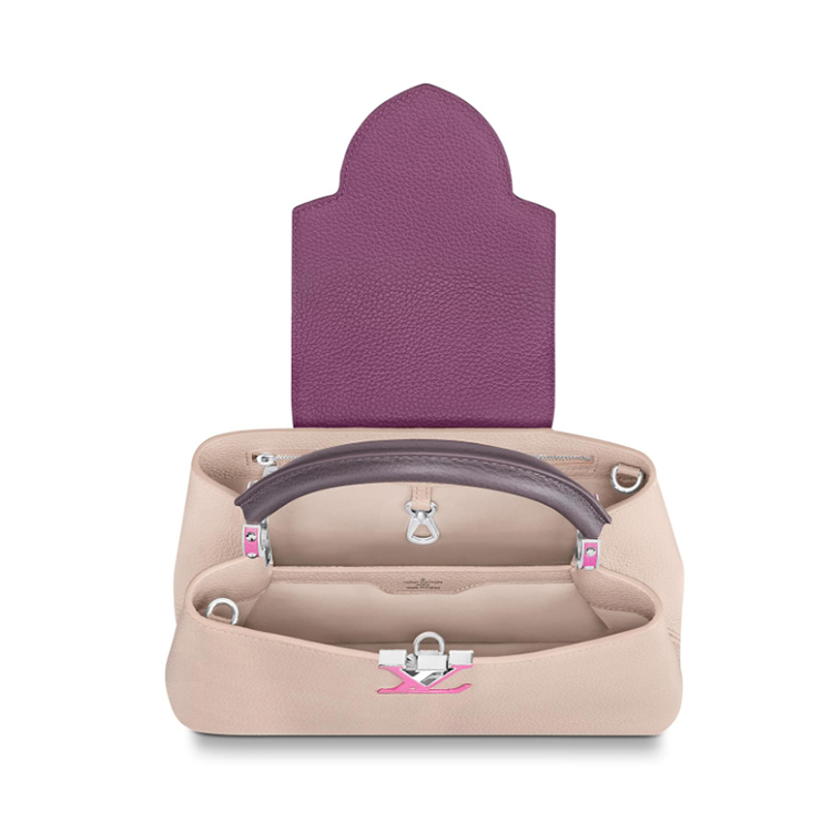 For Spring 2019, the Colorblock theme brings a lively twist to the Capucines PM handbag in Taurillon leather. The dominant black of the bag is contrasted with a white flap and a light pink handle and strap. As with all Capucines, the flap can be worn inside the bag to feature the LV Initials signature or outside for a more discreet look.