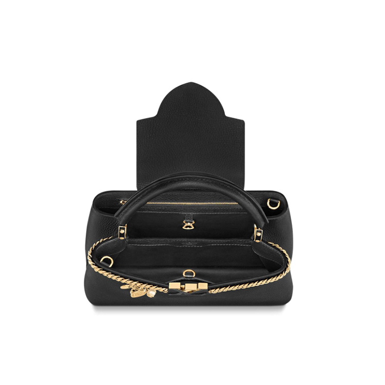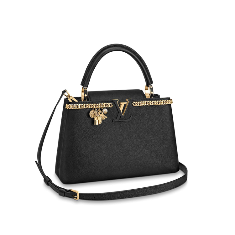 The Capucines PM handbag is crafted from black Taurillon leather with a gold-tone chain at the top. On the upper right hand side, the chain is ornamented with LV charms, bringing a feminine touch to this sophisticated bag. Ideal for day-to-evening use, it can be carried by hand or over the shoulder with its removable strap.
