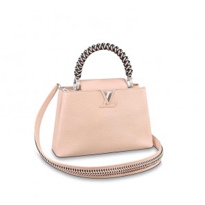 For Fall 2019, the Capucines PM handbag is made from Taurillon leather and features a braided handle of contrasting colored leather threads. This light, sophisticated bag can be worn in a host of ways: over the shoulder or on the elbow, cross-body, with the flap out or tucked inside to display the distinctive covered LV Initial signature.
