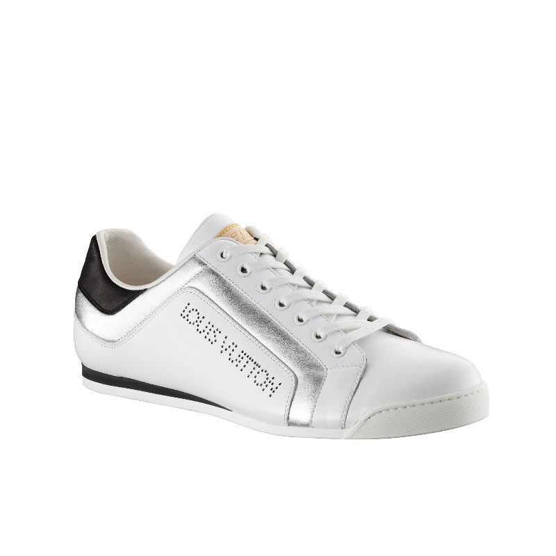 This stylish urban sneaker features striking metallic or patent leather trim and an outsize perforated Louis Vuitton signature.
