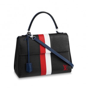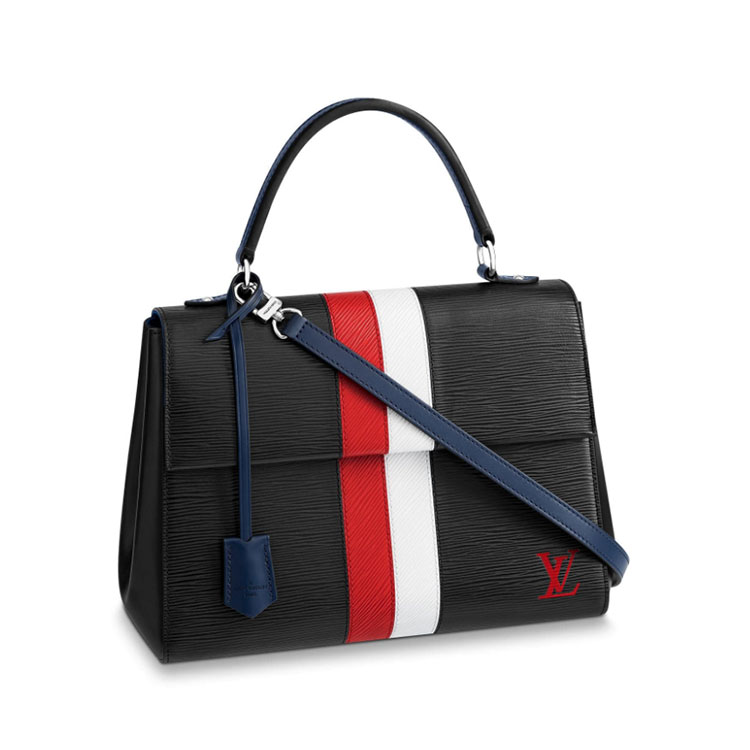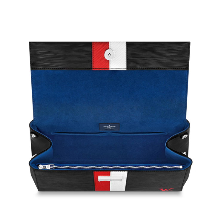 This Cluny MM handbag is fashioned of grained Epi leather and features two bold stripes, separately stitched, and shiny silver hardware. The unexpected combination of colors on the LV signature and trim makes a bold fashion statement. The two-tone stripe is a detail seen on shoes in the Fall 2018 Collection and evokes the House鈥檚 orgins as trunkmakers.