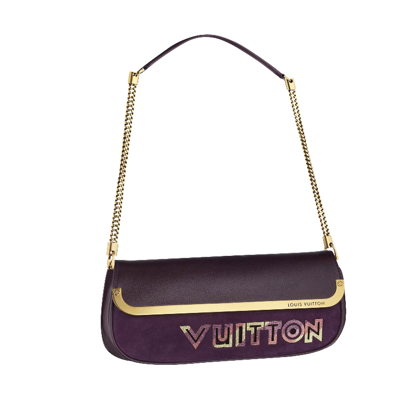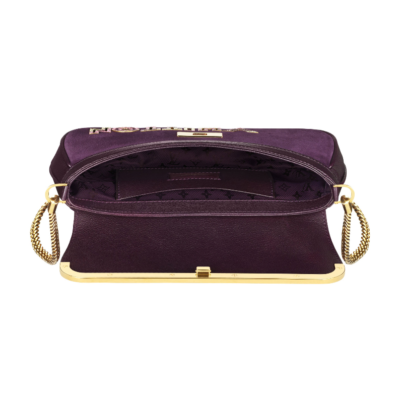 Embrace bold Art Deco chic with the Clutch Avant-Garde. Dazzling crystals complement shiny goatskin and the natural hues of the velvety soft suede, while golden metallic details add a vintage touch.