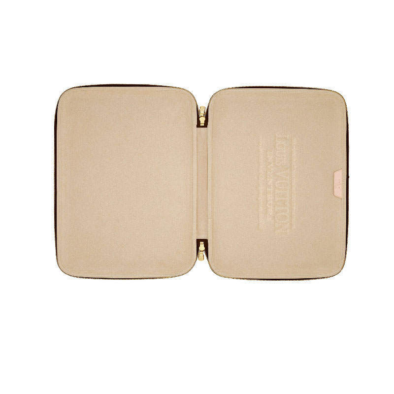 This larger sized, slim Computer sleeve in classic Damier canvas opens flat thanks to a double zipper. The laptop compartment is foam-lined and sports an embossed Louis Vuitton inventeur signature.