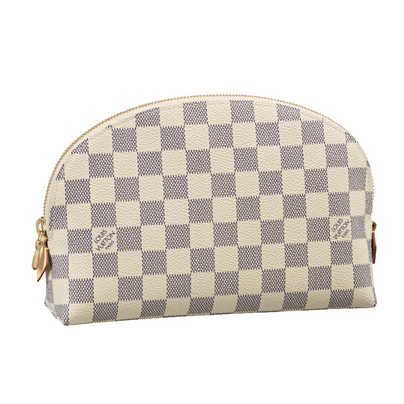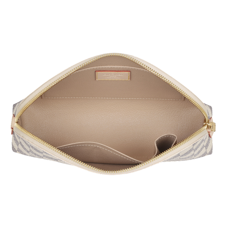 -Cowhide leather trimmings-Shiny golden brass hardware-Wide, zipped opening-2 interior flat pockets-Lipstick compartment