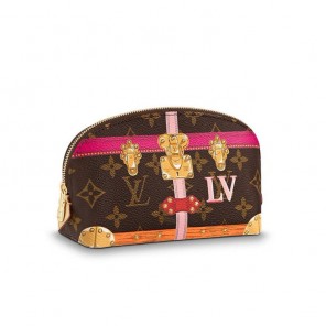 The Cosmetic Pouch in Monogram canvas is printed with bold trompe-l'?il details - a brass lock, corners and leather straps - inspired by Louis Vuitton's historic trunks. This special edition, part of the Trunk Summer 2018 accessories collection, references the House's travel heritage. Both practical and stylish, this makeup bag features a wide opening and washable lining.