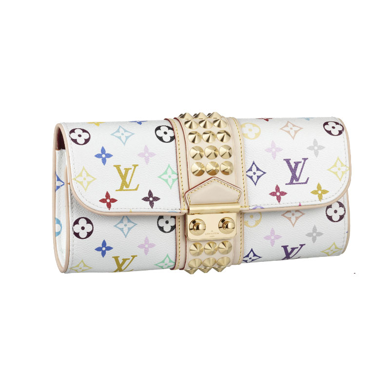 Bright and feminine, the Courtney Clutch adds a touch of daring style. The Monogram Multicolore canvas and golden brass studs bring a striking touch of colour and rock attitude to any wardrobe.