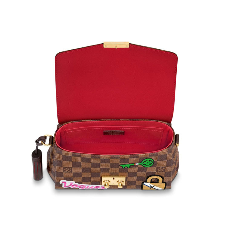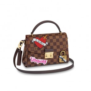 The compact Croisette handbag is reinterpreted in Damier Ebene canvas accented with playful luggage “stickers”, evoking the House's historic connection to luxury travel. Gold-color hardware and a removable tassel in smooth leather complete the elegant classism of this flawless top-handle bag. The removable strap adds an over-the-shoulder carry option.