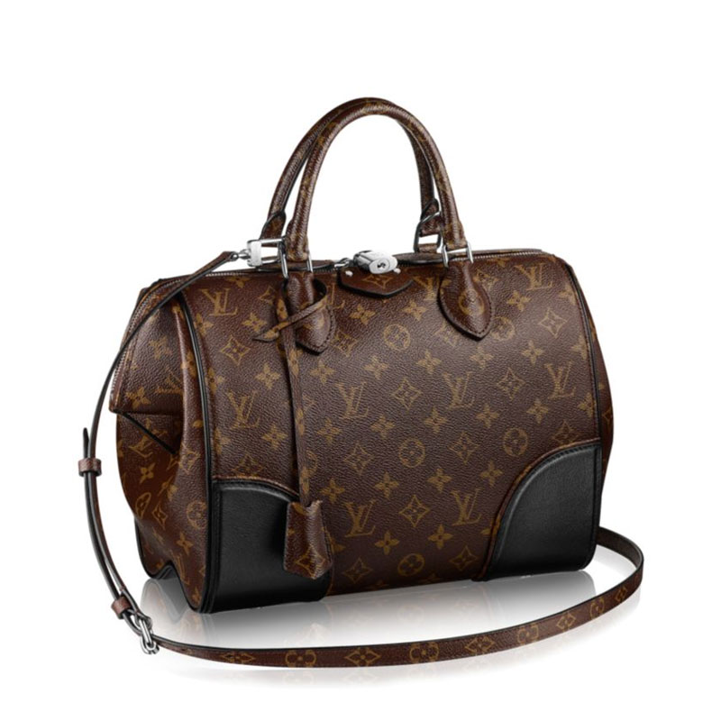 Inspired by the iconic Speedy and first introducted for the FW14 show, the Doc bag is reinterpreted in shiny Monogram canvas for a rock and modern style for Fall. Matte-leather corners are echoed in the contrast edge dyeing: a subtle touch of fine House craftsmanship. The scaled-down PM size can be carried over the arm or cross-body, thanks to the removable strap. Though diminutive, the Doc Bag "opens wide" to hold a full complement of daily essentials.