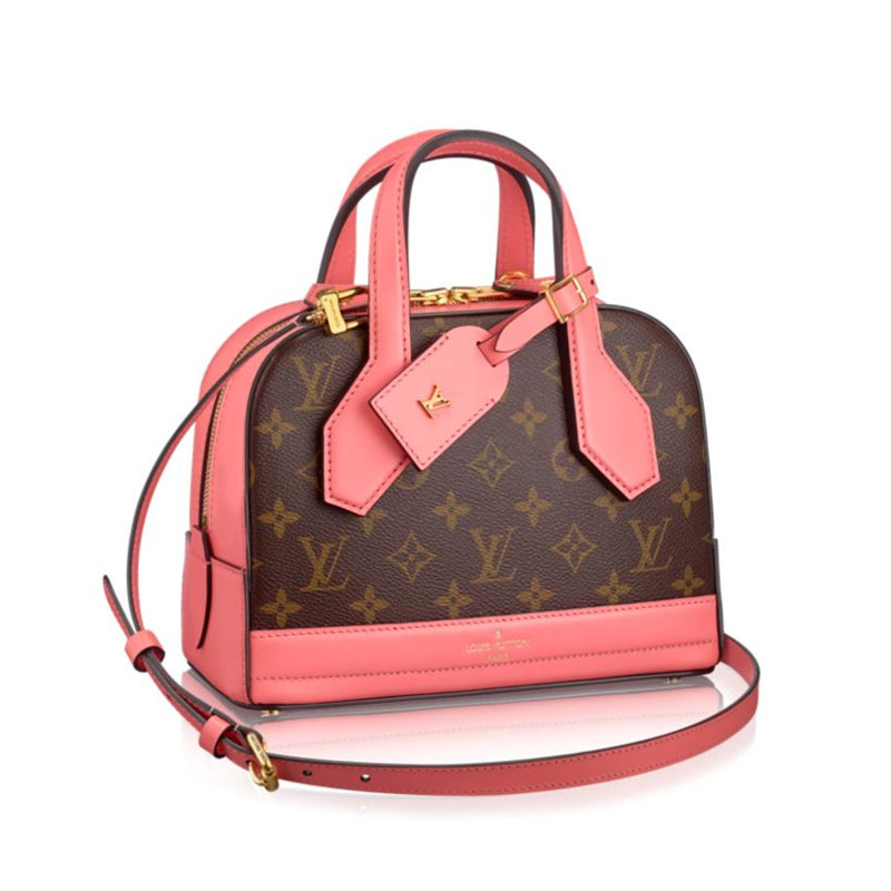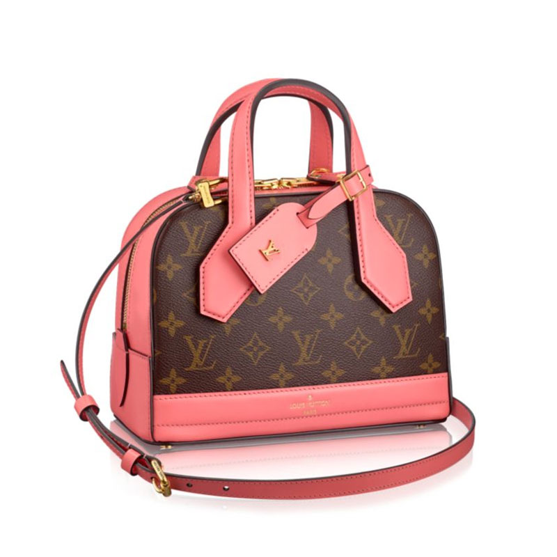 The fashionable mini size of the Dora bag brings together timeless House codes and a contemporary attitude. With lines inspired by by two historic travel bags, introduced with F/W 14 show is reinterpreted in fresh colors. It features iconic Monogram canvas framed and accented by leather, for maximum graphic impact.