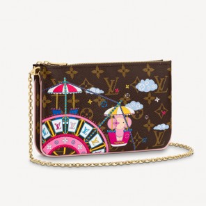 Louis Vuitton's mascot Vivienne rides on a big wheel on this exclusive Christmas 2020 edition of the Pochette Double Zip in Monogram canvas. The joyful, brightly colored illustration incorporating House symbols makes this a perfect gift for the festive season. This versatile pouch features several pockets, two card slots and a removable chain.