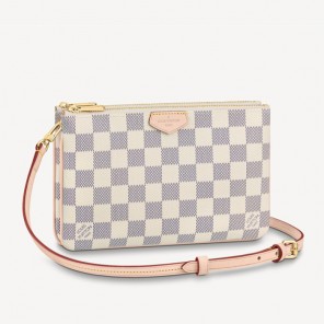 This summery version of the Double Zip Pochette comes in Damier Azur canvas with a removable strap in Louis Vuitton's emblematic natural cowhide leather. This versatile pouch features two secure zipped pockets with an open pocket in between. It is finished with a natural leather label embossed with the House signature.