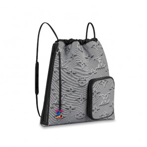 With the ultra-light Drawstring Backpack in embossed Monogram gray-black textile, Virgil Abloh breaks even further away from traditional luxury codes. This soft backpack fuses the properties of performance-oriented, technical activewear with hypermodern style. Signed with the metallic rainbow-color LV Initials, this is part of the Louis Vuitton 2054 capsule collection.