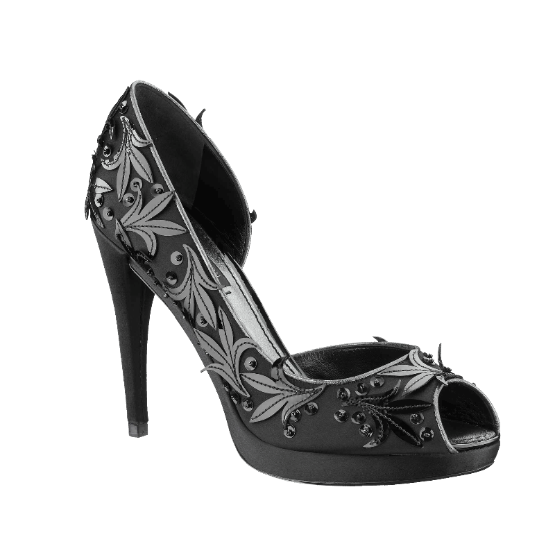 Inspired by a dress worn by Marilyn Monroe, these satin peep-toe pumps are richly embroidered with vintage-look black patent leaf motifs, beads and sequins for an effect that is pure glamour.