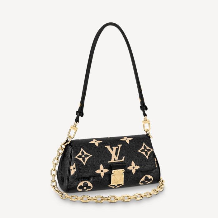 The Favorite is a fashionable baguette shoudler bag made from supple grained leather with an oversized embossed Monogram pattern. Feminine pleats bring a couture touch while the gold-color magnetic lock evokes Louis Vuitton鈥檚 heritage. A removable and adjustable strap enables short-shoulder carry or cross-body wear while a blod detachable gold-color chain allows more glamorous evening use.