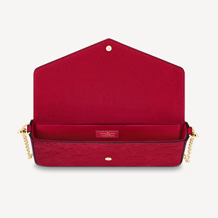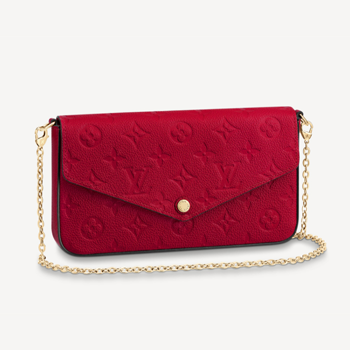 The Pochette F茅licie is crafted from Monogram Empreinte leather, embossed with Louis Vuitton's signature Monogram pattern. Designed to adapt to modern lifestyles, this envelope-style pouch contains a spacious compartment with two removable pockets: one zipped, one with card slots. It can also be carried in different ways thanks to a removable gold-tone chain.