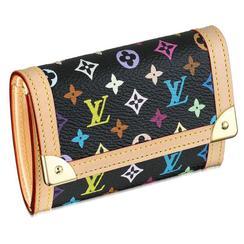 This flat coin purse in the Monogram Multicolore canvas created by Takashi Murakami opens to reveal a gusseted compartment. A separate pocket holds small papers.