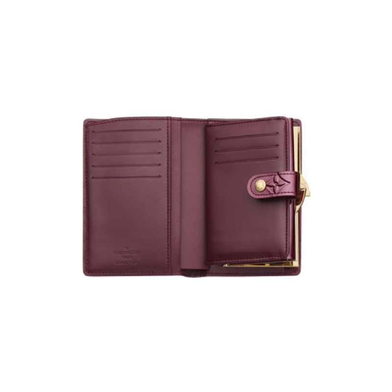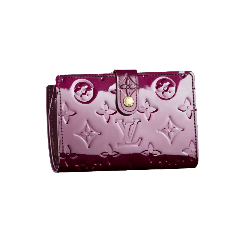 This wallet in Monogram Vernis leather features four credit card slots, one closed change compartment and a compartment for bills and papers.