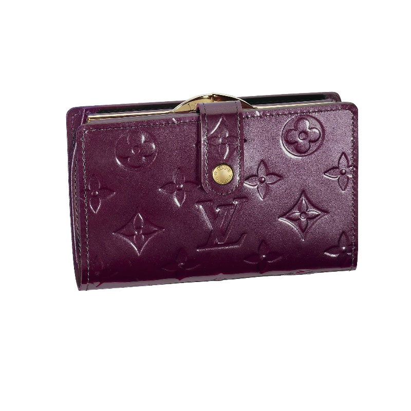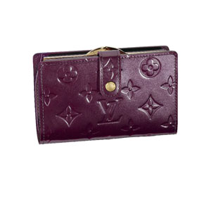 This wallet in Monogram Vernis leather features four credit card slots, one closed change compartment and a compartment for bills and papers.