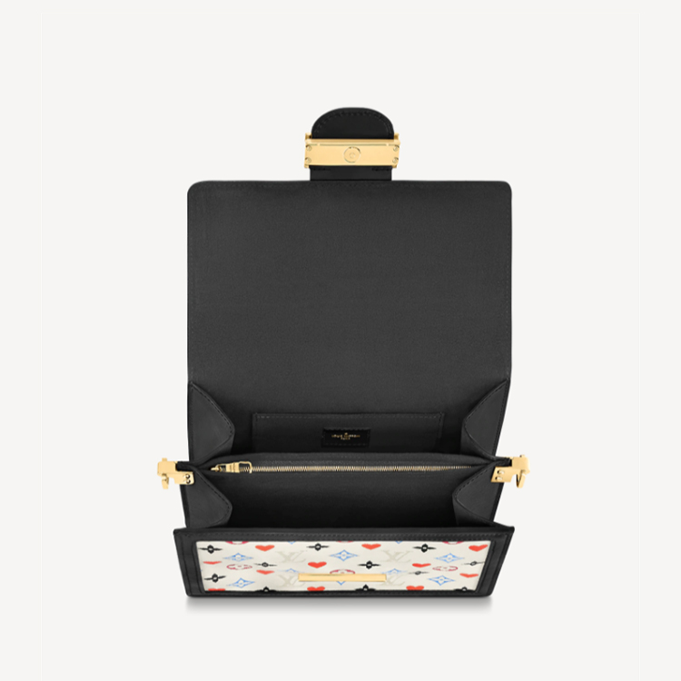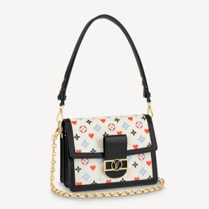 In colorfully graphic Game On Monogram canvas with black leather trim, the structured lines of the Dauphine MM handbag are reborn for Cruise 2021. On this Monogram print some of the Monogram Flowers are replaced with red hearts. With its gold-color chain strap and signature lock, the Dauphine dresses up any outfit.