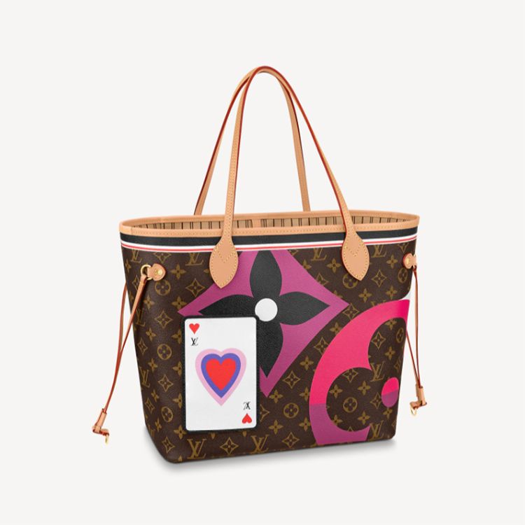 For Cruise 2021, Nicolas Ghesqui猫re fashions the Neverfull MM tote bag in Monogram canvas adorned with a bold print blending Monogram Flowers and symbols of playing card suits. With a new outside pocket that looks like a playing card and another on the removable zipped pouch, this versatile tote becomes a playful homage to gaming.