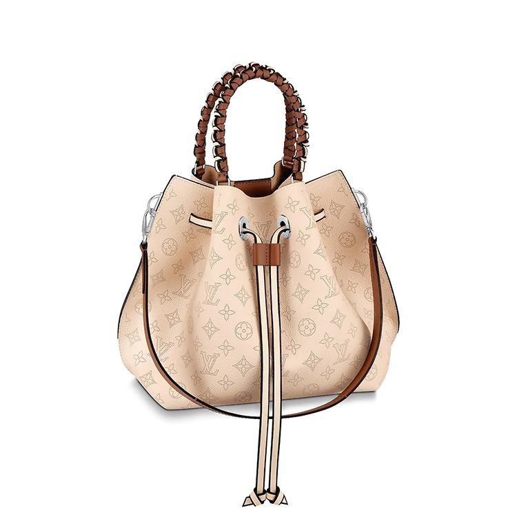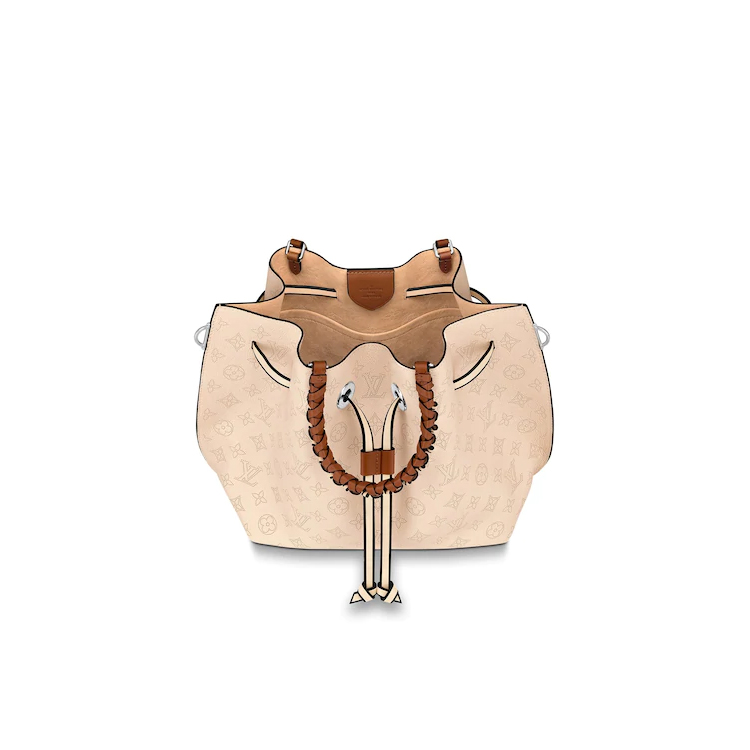 The Girolata handbag in Mahina calfskin with braided top handles and the perforated Monogram pattern incarnates causal chic. A subtle pastel colorway and details like large edge dyeing on the braided top handle confirm it. Versatility incarnate, it can be carried with the drawstring open as a large tote or closed, as a bucket bag.
