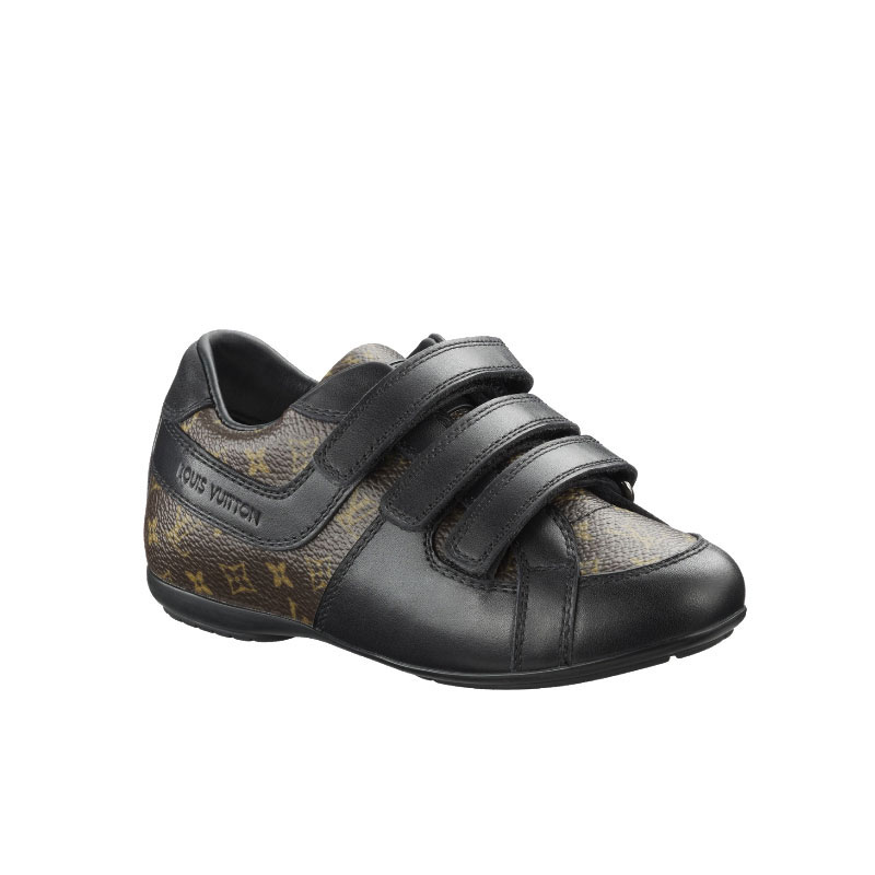 Iconic Monogram canvas is teamed with black calf leather on this children's sneaker, which features sporty velcro straps and the Louis Vuitton signature embossed on the side.