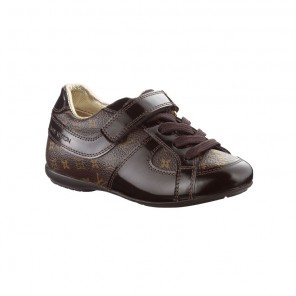 Iconic Monogram Canvas and eye-catching metallic leather are a winning combination on this children's sneaker, which features a sporty velcro strap and the Louis Vuitton signature embossed on the side.