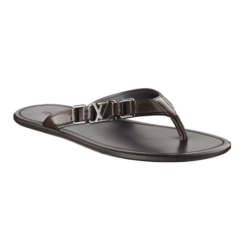 Slender straps in fine calf leather are accessorized with the iconic LV initials on this elegant thong, which is a timelessly stylish choice for hot summer days.